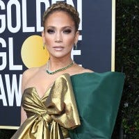 The 'Hustlers' nominee arrives on the red carpet in a statement bow number with fiance Alex Rodriguez.