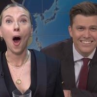 Scarlett Johansson reacts to her husband Colin Jost’s dirty jokes about her during 'Saturday Night Live’s Weekend Update segment.