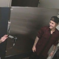 The pop star and the comedian pranked people by hiding in a bathroom stall.