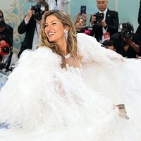 Gisele Bündchen makes an entrance at the 2023 Met Gala twirling in a white gown topped with a feathery cape.