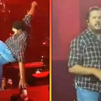 Luke Bryan falls hard on stage after slipping on a fan's phone during a performance in Vancouver over the weekend.