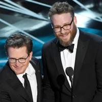 The 'Back to the Future' star rode in on the Delorean with co-presenter Seth Rogen.