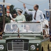 The Jaguar Land Rover that will be used to transport the late duke's coffin is displayed at Windsor Castle.