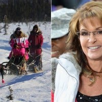 Sarah Palin hops on the back of a dog sled for her new show Amazing America with Sarah Palin.