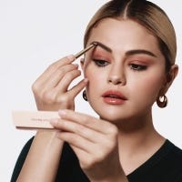 See how the actress fills in her brows with the new Rare Beauty product in her makeup routine.