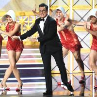The 53-year-old Emmy host hit the stage with some 'Handmaids' and some 'hands-men' of his own.