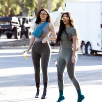 The stylish sisters have a twinning moment in fitted gray ensembles.