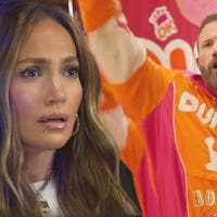 Ben Affleck embarrasses wife Jennifer Lopez by rapping with Matt Damon and Tom Brady in a Super Bowl commercial.