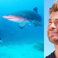 Thor goes swimming with sharks for National Geographic’s Shark Fest week.