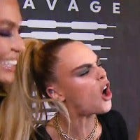 ET caught the hilarious moment while on the red carpet at Rihanna's Savage X Fenty runway show during NYFW.