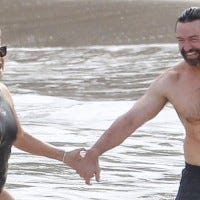 The 47-year-old 'Wolverine' actor and his 60-year-old wife caught some rays and some waves on the beach in St. Barts on Monday.