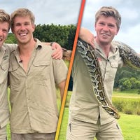 Robert Irwin bonds with his look-alike contest winner, Ben Marshall, after returning home to Australia.