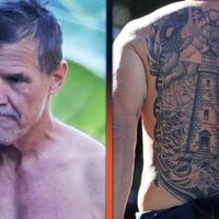 Josh Brolin debuts a massive new lighthouse tattoo on his back while surfing in Santa Barbara on Sunday.
