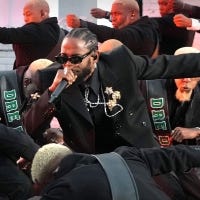 Kendrick Lamar pays homage to Dr. Dre during his halftime show performance at Super Bowl LVI.