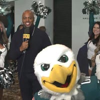 The Philadelphia Eagles cheerleaders and mascot Swoop show off their dance moves with ET’s Kevin Frazier ahead of Super Bowl LIX.