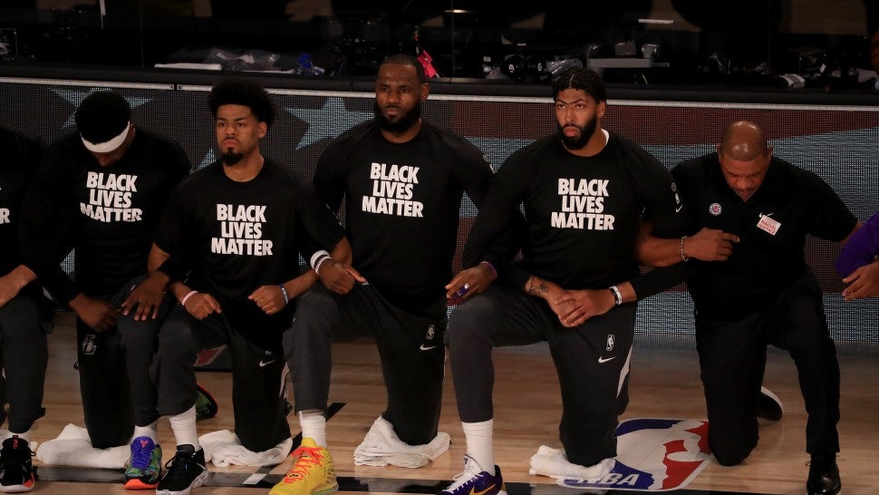 LeBron James, Anthony Davis and fellow NBA players kicked off the return of the season by showing their support for the Black Lives Matter movement during Thursday's games. The game between the Los Angeles Lakers and the Los Angeles Clippers, held at The Arena at ESPN Wide World of Sports Complex in Lake Buena Vista, Florida, began with the players kneeling and wearing Black Lives Matter shirts as the Compton Kidz Club virtually performed the national anthem.