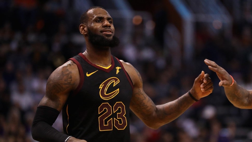 The NBA star made a young fan's night at the Cavaliers game against the Phoenix Suns in Arizona on Tuesday, after spotting his sign reading, "King James, you are more than an athlete #NeverShutUp." After checking out of the game for the night, James handed off his shooting sleeve to the kid, who was sitting courtside.