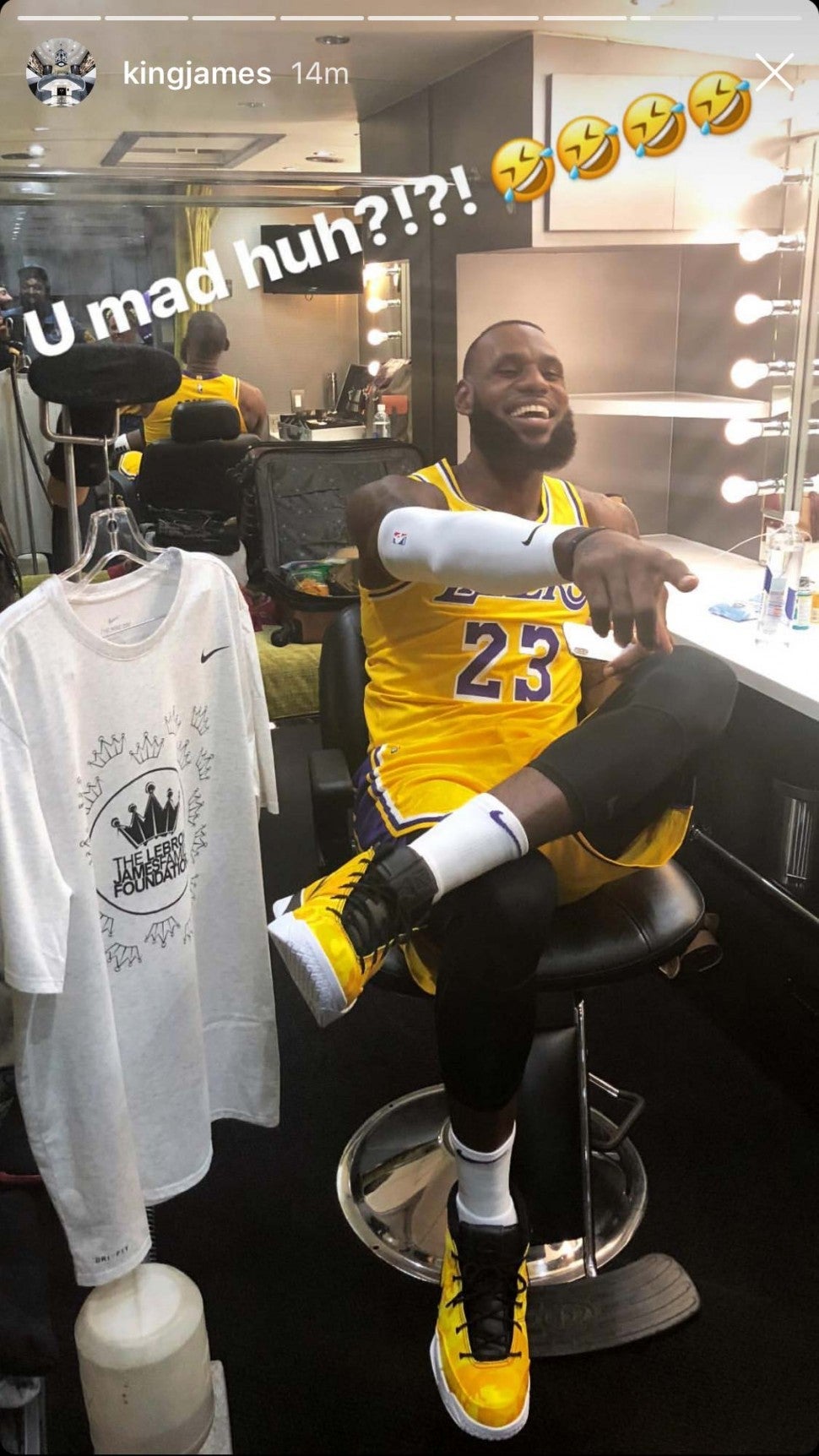"U mad huh?!?!" James wrote on the snapshot, along with some laughing emojis. To make the dig more readily apparent, he followed it up with a final snapshot that was just a close-up of the Kobe-branded sneakers, over which he wrote, "Oh my bad I didn't properly intro these on my last post," along with more laughing and fire emojis.