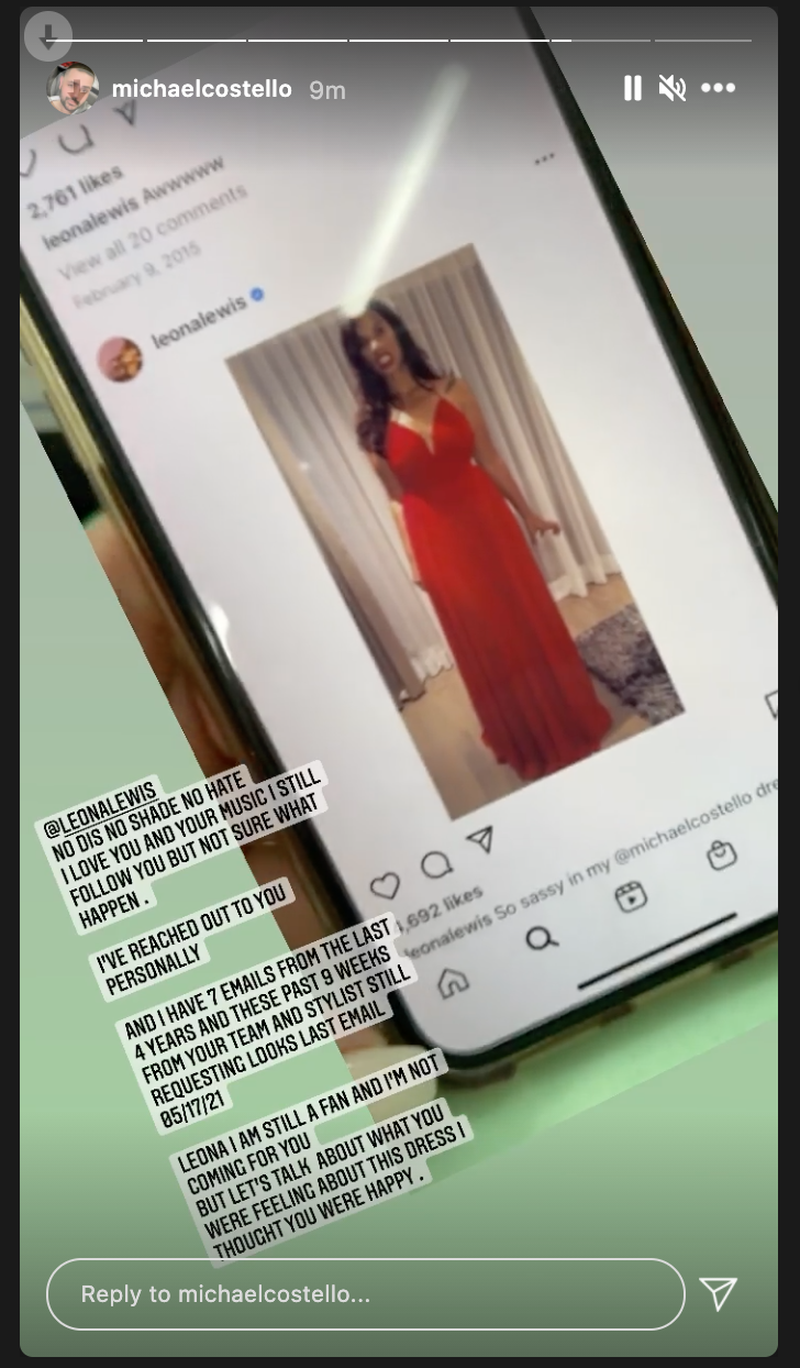 "No dis, no shade, no hate. I love you and your music I still follow you but not sure what happen," Costello wrote alongside a screenshot of Lewis in a red gown. "I've reached out to you personally and have 7 emails from the last 4 years and these past 9 weeks from your team and stylist still requesting looks. Last email 05/17/21."