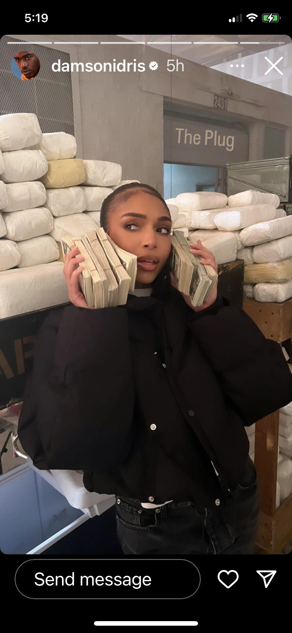 The second photo shows Harvey holding two giant stacks of money in what looks to be a part of the set of Idris' popular NAACP Image Award-nominated show, captioned, "The Plug."