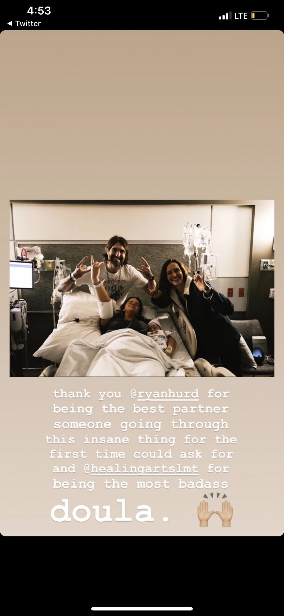 The new mom thanked her husband and "badass" doula in another post on her Instagram Story.
