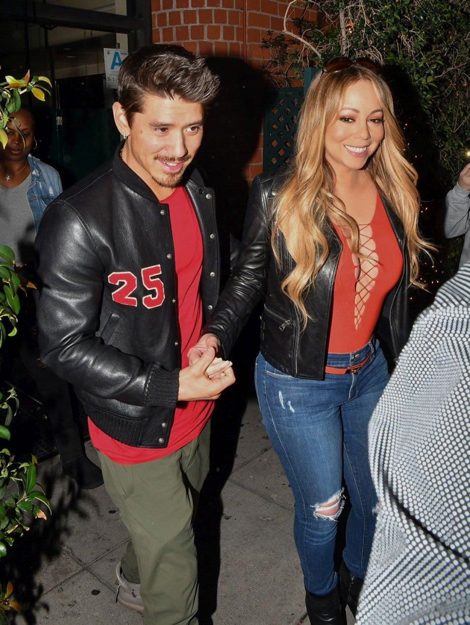 Carey turned heads in a bright red, lace-up bodysuit, which she styled with high-waisted distressed skinny jeans and black leather boots. Her matching red belt and leather jacket gave the sexy ensemble an edgy spin, while accentuating her slim waist.