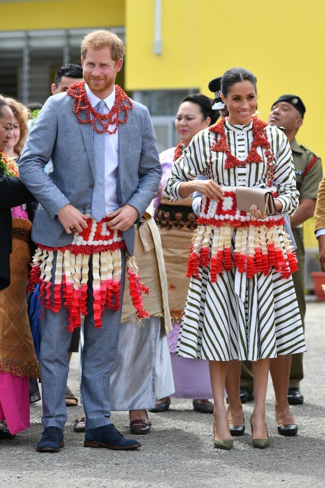 Per usual, the couple looked adoringly at each other, flashing big smiles while photographers snapped their pics as they made their way into the St. George's Government building in Nuku'alofa, Tonga, where they met with Tongan prime minister ʻAkilisi Pōhiva. Meghan arrived in a A-line belted Martin Grant shirtdress with olive and white stripes, giving fans a peek at her baby bump.