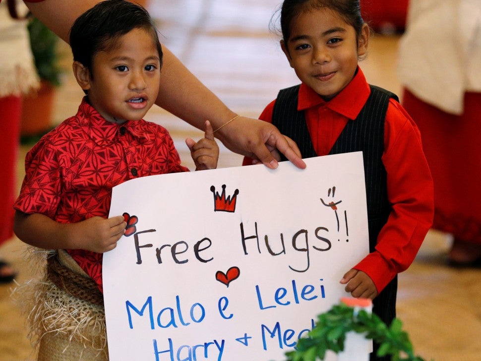 Prince Harry looked dapper as can be, clad in a gray suit with a white shirt and light blue tie, as the pair waved at the gathered crowd, which included some adorable kids -- one of whom was holding a sign advertising "Free Hugs!"