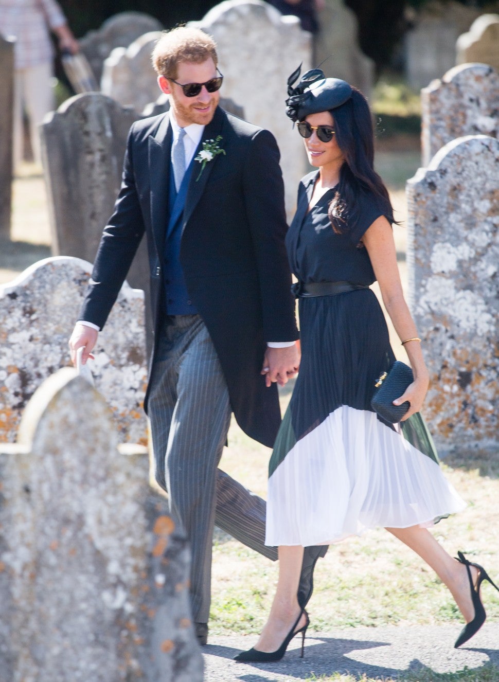The Duchess of Sussex looked stylish as ever for the occasion, wearing a pleated shirtdress featuring an olive, pink and white skirt. She accessorized with a Philip Treacy fascinator, a knotted belt, black Aquazzura pumps and a clutch by Kayu. And unlike some of her more recent buttoned-up looks, Meghan opted to show a little skin, revealing a hint of black lace under her dress.