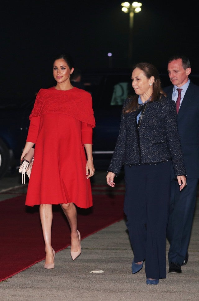 The pregnant Duchess of Sussex couldn't have looked more chic as she and her husband, Prince Harry, arrived in Morocco on Saturday for their last royal tour before welcoming their first child together.