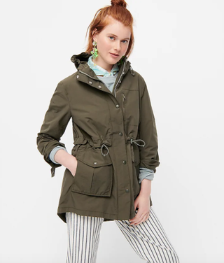 In a clip aired during the couple's interview with Oprah, Meghan was seen showing the media mogul Archie's "Chick Inn" at their home. Meg wore the J.Crew Perfect Lightweight Jacket in moss green, paired with dark wash skinny jeans, a white shirt and Hunter rain boots.