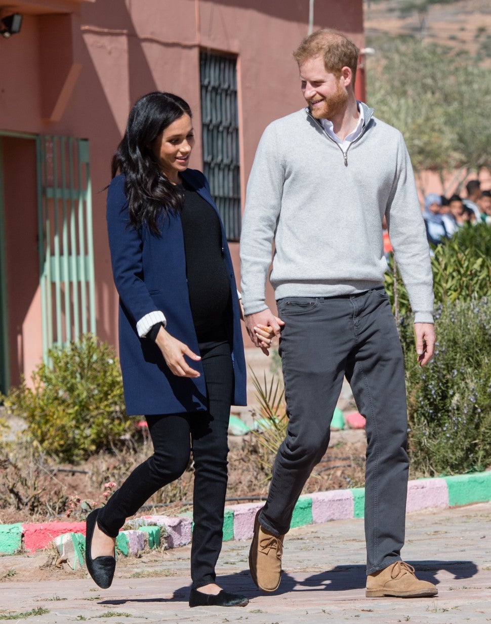 When dressing down, the royal always reaches for her black maternity skinny jeans. The stretchy pair naturally calls for equally comfortable shoes like slip-on flats. She tops it off with a blazer, of course, to slightly dress up the look.