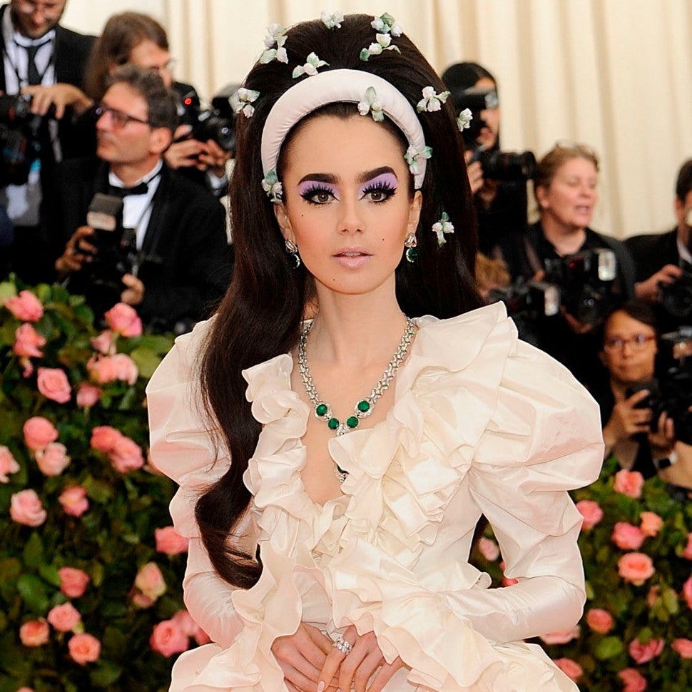 "When I saw Lily’s Giambattista Valli Couture Gown and her Cartier jewelry, I instantly thought wedding. Because of the ruffles and Moire silk fabric, my mind went to two of my favorite beauties: Sharon Tate and Priscilla Presley. I wanted to do an exaggerated version of their wedding hairstyles to fit the theme of Camp," hairstylist Gregory Russell exclusively told ET.