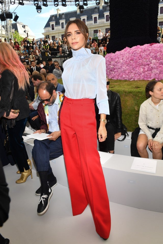 The Spy Who Dumped Me leading lady stepped out in New York City wearing a chic combination of light blue blouse and red wide-leg trousers. This look immediately reminded us of the ensemble Beckham wore back in June at the Dior menswear show, and it turns out the actress' outfit is from the fashion designer's line! Kunis and Beckham are wearing the same pant, but the actress' blouse is a button-down in a slight green-blue hue and the former Spice Girl's is a high-neck style.