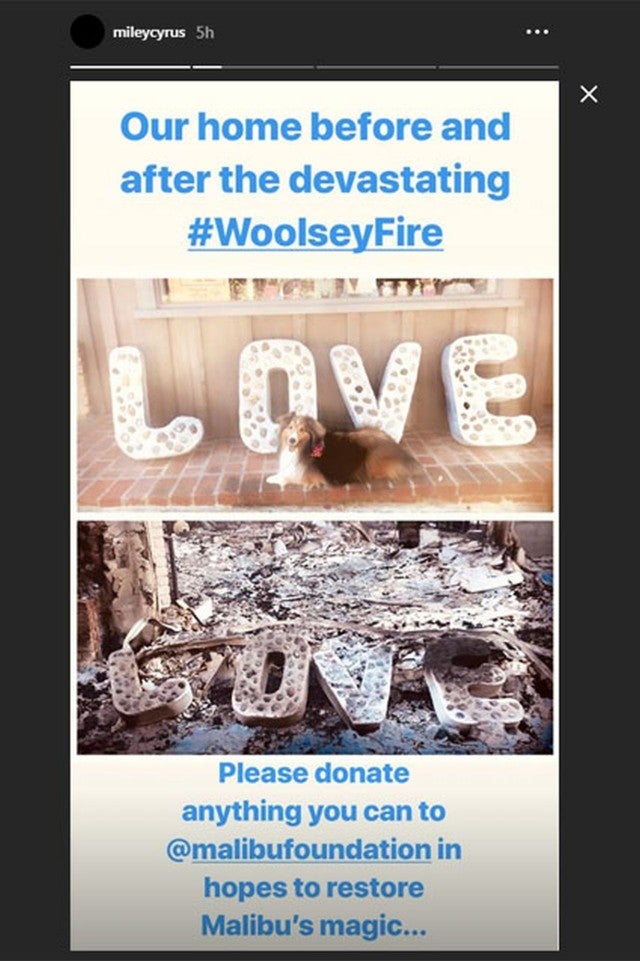 "Our home before and after the devastating #WoolseyFire," Cyrus captioned one of the photos. "Please donate anything you can to @malibufoundation in hopes to restore Malibu's magic."