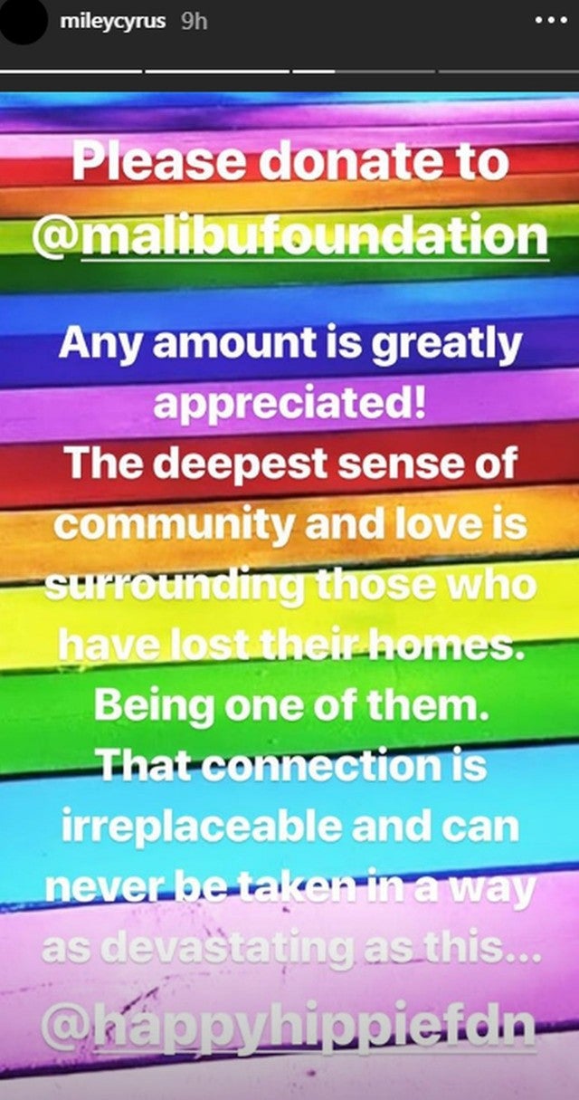 "Miley and Liam lost their home but are very grateful to be safe along with their animals!" the statement read. "Their community and state are very special to them and they want to give back to the place that has created so many beautiful memories for themselves and others. They are donating $500,000 to The Malibu Foundation through Miley's charity, Happy Hippie, in hopes to restore Malibu’s magic."