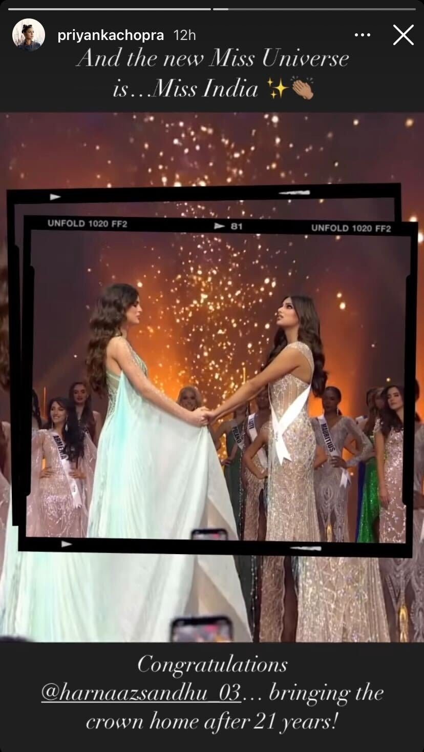 Indian actress Priyanka Chopra Jonas, who won Miss World in 2000, congratulated Sandhu for "bringing the crown home after 21 years."