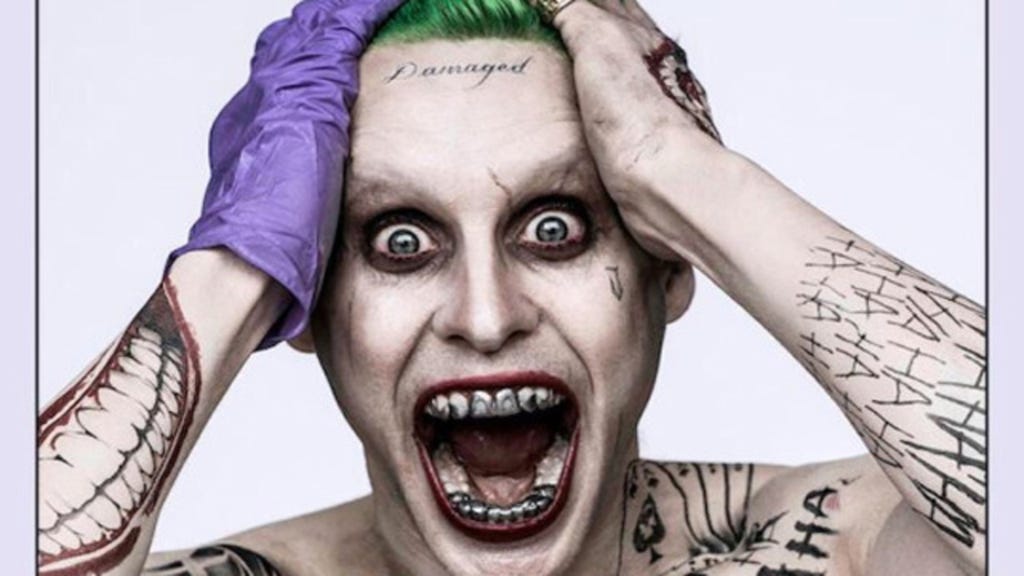 — David Ayer (@DavidAyerMovies) April 25, 2015 In the new image, Leto dons the Joker’s signature green hair, decaying teeth and a body marked with tattoos, featuring a set of playing cards as tombstones, his maniacal laugh (“HAHAHA”) and classic red lips.