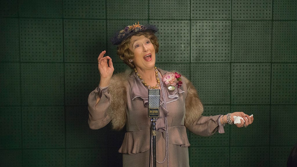 Globe-nominated performance -- her 30th nomination -- in the delightful biopic, Florence Foster Jenkins, which earned a