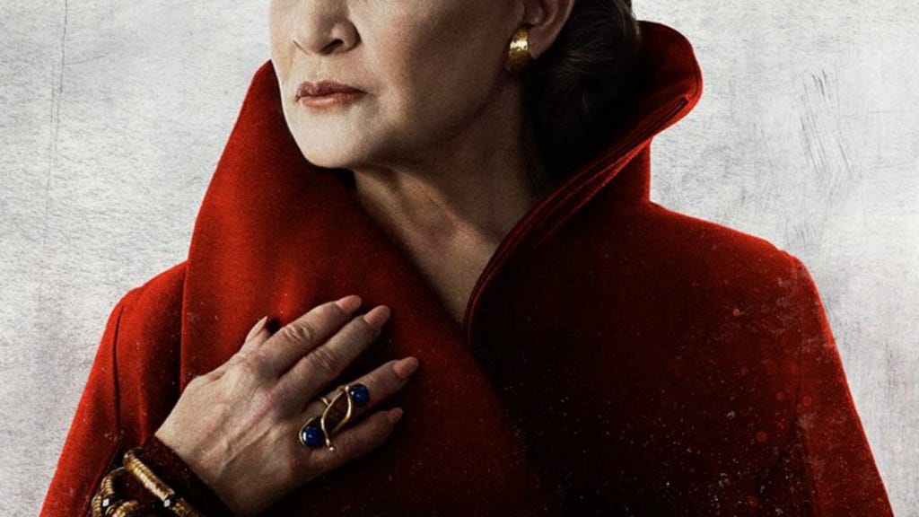 The late actress, who passed away in December 2016, appears as General Leia in the latest one-sheet, which shows her standing tall, dressed in an elegant red coat and gold jewelry.