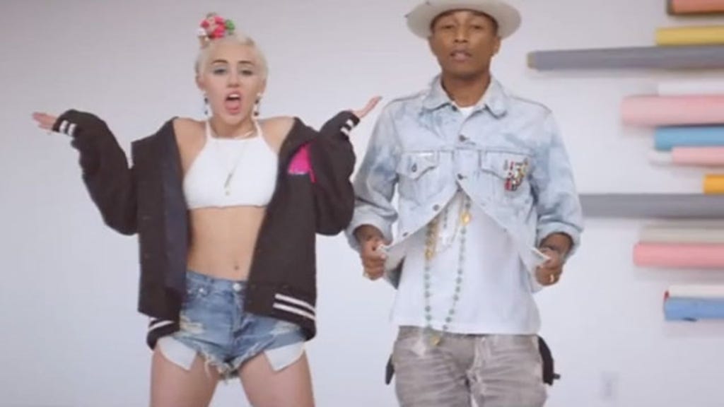 About two and a half minutes in-- the first half just shows a bunch of different women dancing-- Miley and Pharrell show up in a shot together where the singer is donning a crop-top, short jean shorts and a black jacket. Pharrell is, of course, wearing one of his trademark hats.