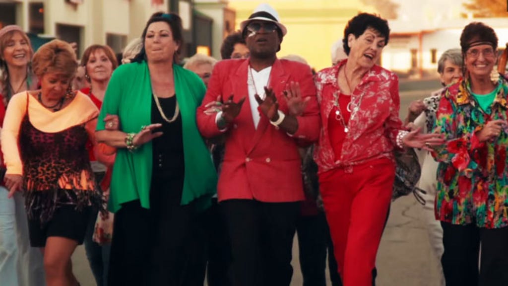 Boye's video is a pitch-perfect send up of "Upton Funk"'s stylish video, only replacing the nice car with a rascal scooter and all the young backup dancers with older singers in their late 50s and 60s. Check out the original version for a comparison.
