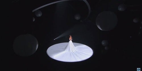 As the camera pans out and the lights open up, it seems as if the custom-made dress might never end, and eventually we find out that it takes up nearly the whole stage – or 20 feet in circumference, to be exact.