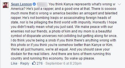 "You think Kanye represents what's wrong w America?" Lennon wrote. "He's just a rapper, and a good one at that. There is sooooo much more that is wrong w america besides an arrogant and talented rapper."