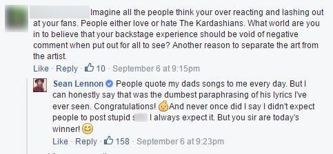 And when one commenter quoted Lennon's father's song, "Imagine," to suggest he was overreacting, Lennon responded, "People quote my dads songs to me every day. But I can honestly say that was the dumbest paraphrasing of his lyrics I've ever seen."