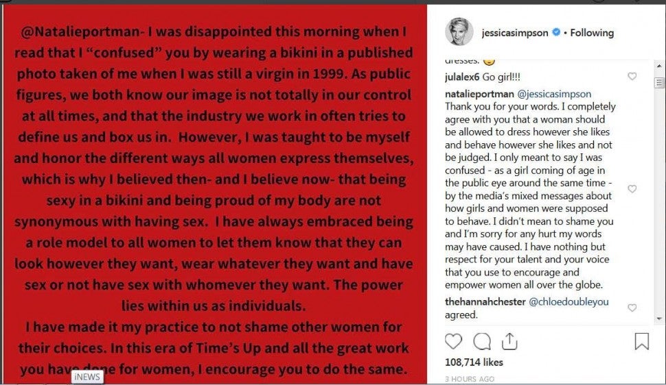 Portman's comment to USA Today reads, “I remember being a teenager, and there was Jessica Simpson on the cover of a magazine saying ‘I’m a virgin’ while wearing a bikini, and I was confused. Like, I don’t know what this is trying to tell me as a woman, as a girl.”