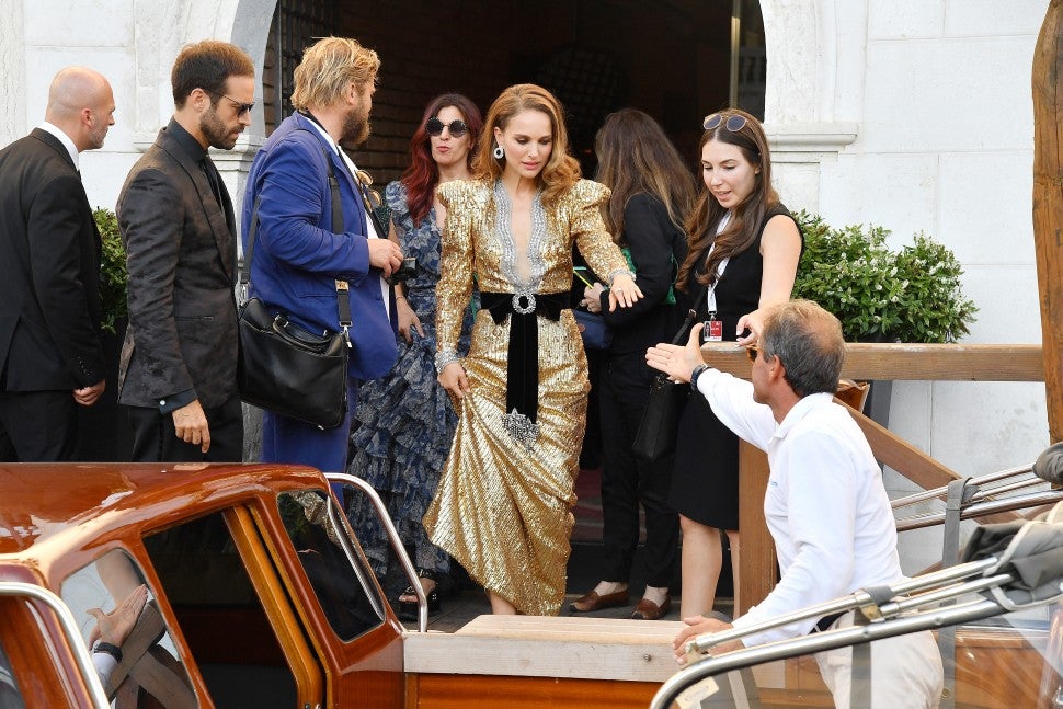 The mom of two was seen stepping onto a boat outside of the Palazzina Grassi Hotel en route to the premiere with dancer husband Benjamin Millepied by her side.