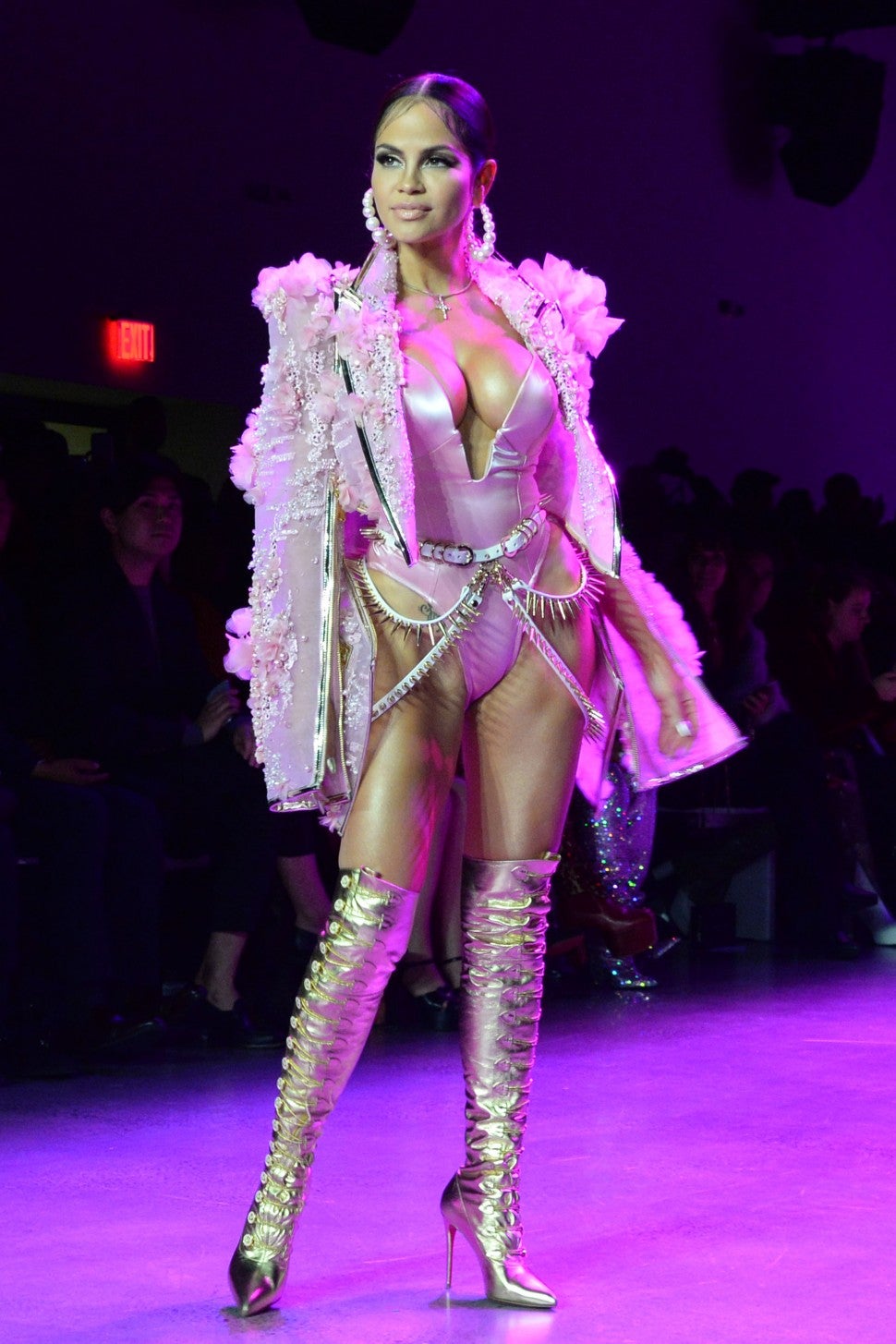 Natti also showed up and showed out by walking in The Blonds runway show. The brunette beauty strutted her stuff in a risqué pink leotard, complete with a white-with-gold spiked belt, embellished jacket and metallic thigh-high boots.