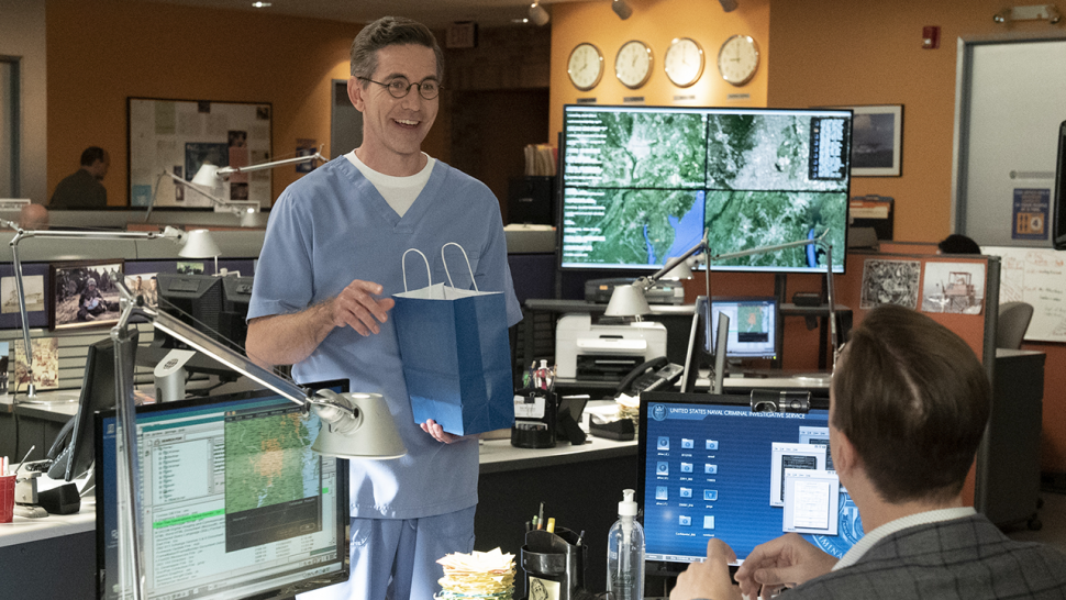 Jimmy's coming in at the top of the show and he has this huge revelation. It almost happened offhandedly because it happened months ago, so this revelation [that his wife died] comes to light. I remember filming the scene with Wil[mer Valderrama] and Sean [Murray] and Emily [Wickersham] and there's an awkwardness and a strangeness about this, of like, "Really? This happened?" As we're performing, it seems strange that you're just saying it out loud and it is a little bit of a whiplash effect. But I think that's the objective of it, is that we're jumping ahead in time quite a bit from the first six episodes of the season, which happened pre-COVID. Now we're jumping forward to today and we're saying, "Okay, here's where we're at. There's a lot to catch up on. Get ready, buckle up." I remember that was one of the first scenes we shot from this episode and it felt, "We're already on a fast-moving train here." It was wonderful though, because as Jimmy felt supported by his team and got what he needed with his team there for him, I felt the same way as an actor. I got my people that I've known and loved for more than a decade and a half, and they were all there for me to help me tell this story that I felt was really, really important.