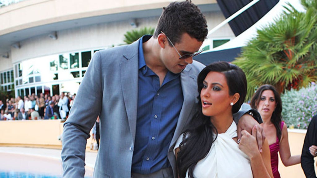 Kris Humphries reportedly matched his groomsmen, wearing a black peak lapel Zegna tuxedo.